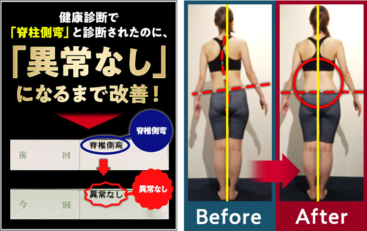 この患者さんは健康診断で毎年「脊柱側弯症」と診断されていたのですが、たった3か月、この治療法「RE:SET」を受けただけで、次の健康診断では「異常なし」と診断されるまで改善!