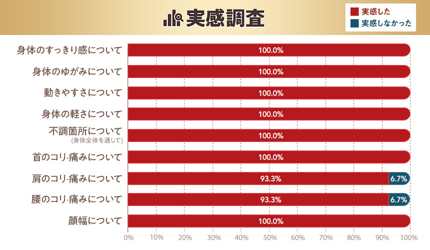 被験者に、施術前と施術後で身体にどれくらいの変化があったのか、下記9項目を評価してもらったところ…ほぼ100%の人が"すべて"の項目において「変化を実感した!」と回答するほど、患者さんにも喜んでもらえました!
