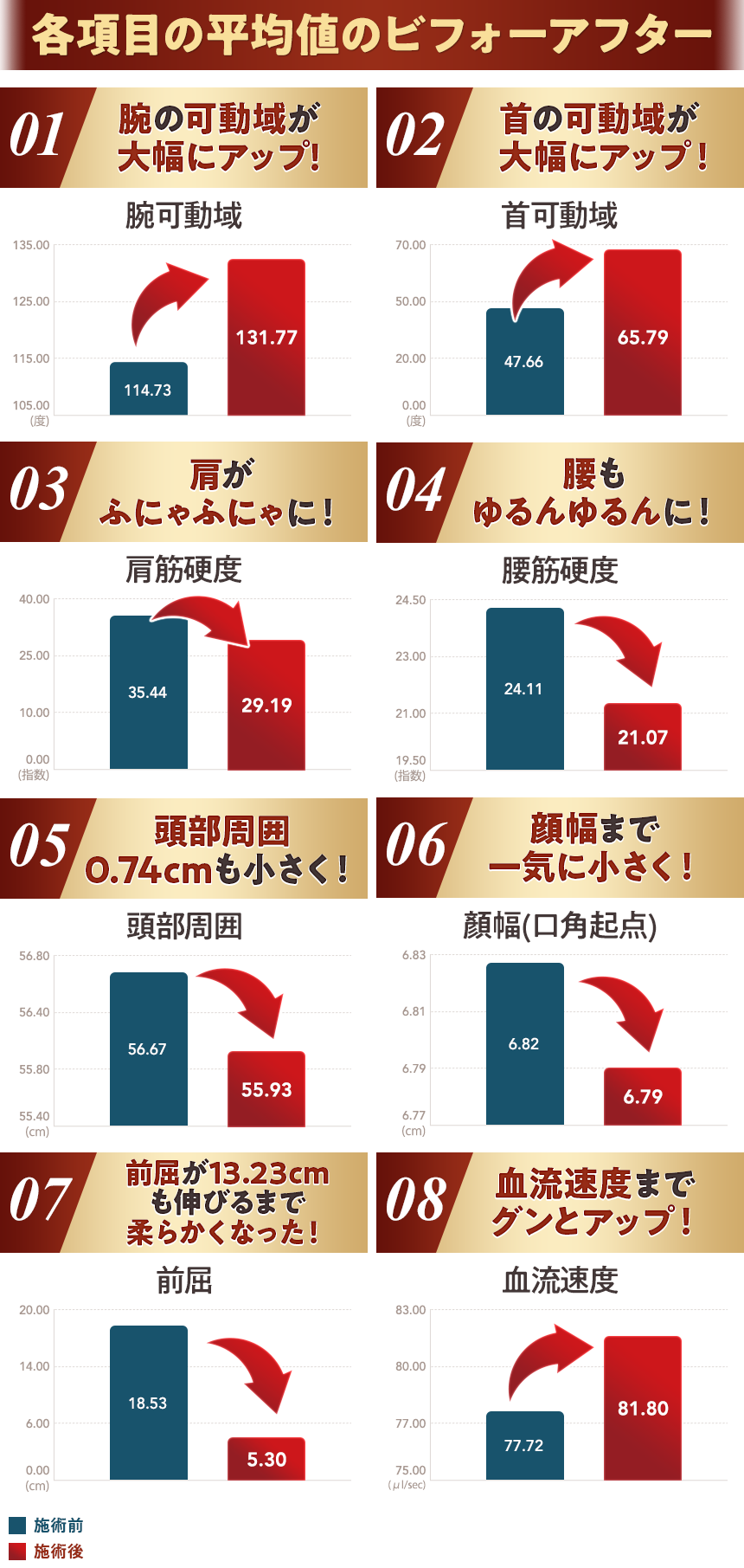 今回のエビデンス試験(臨床試験)では、施術の前後で下記9項目(腕可動域、首可動域、前屈、肩筋硬度、腰筋硬度、頭部周囲、顔幅、姿勢、血流速度)のうち、どの項目が変化するのか計測しました。その結果はなんと…!