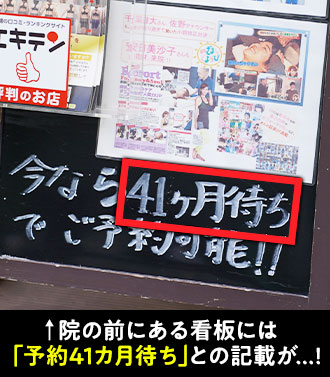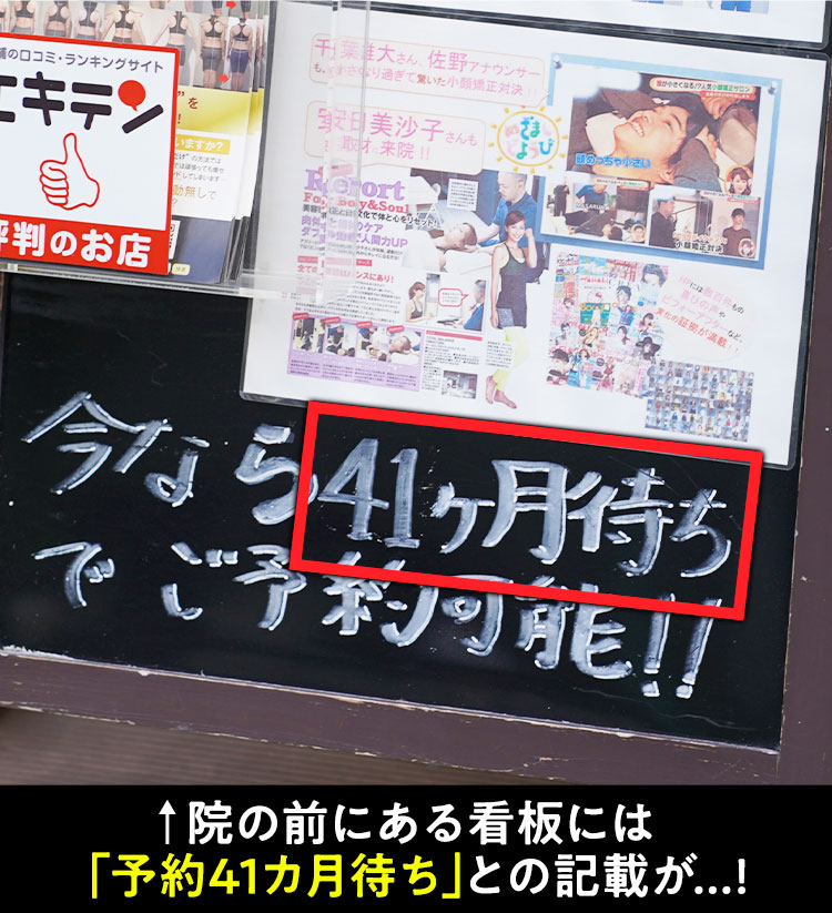 実際に、院の前には「今なら予約41ヶ月待ちでご予約可能!」という看板が立っており、